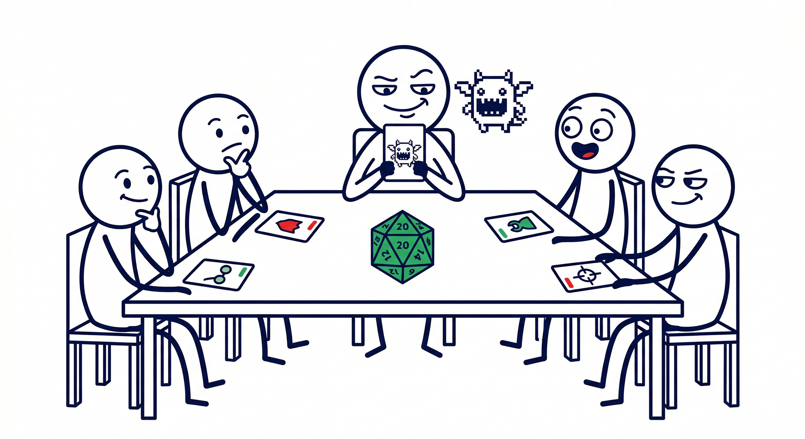 Players (2 minutes): Open the Role Distributor on a phone or laptop. Enter headcount and tap Distribute. Each player opens their role card and places it face-up on the table. You are playing yourselves – no character acting required.